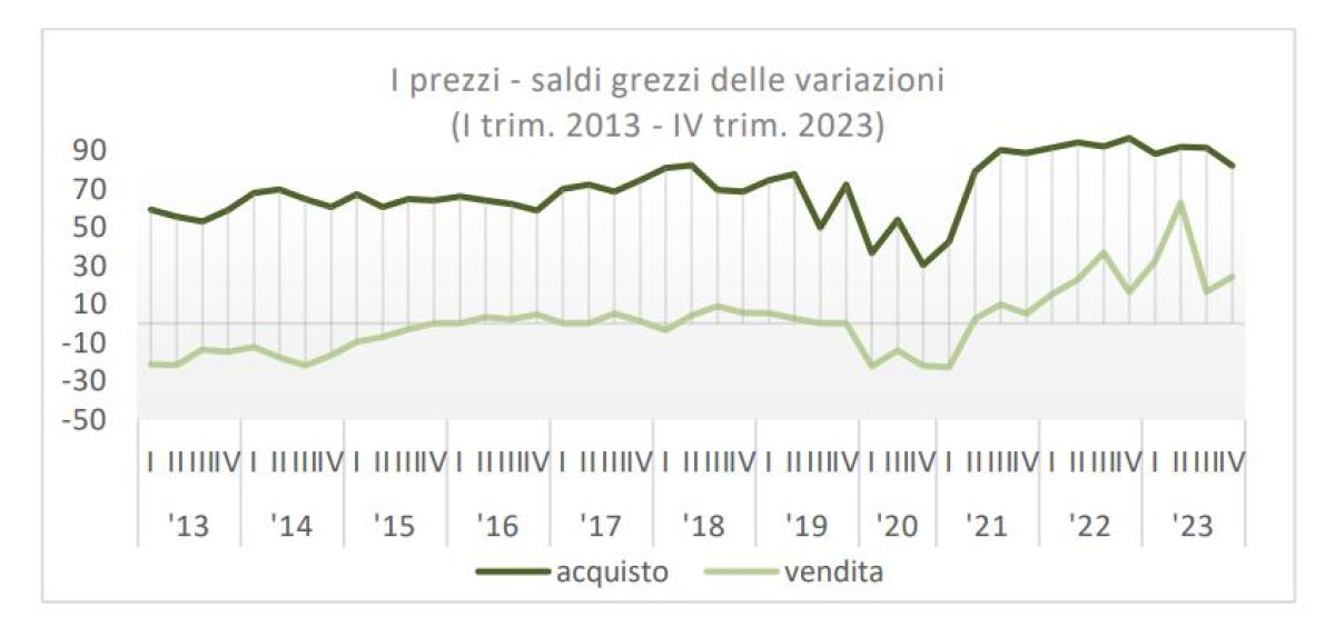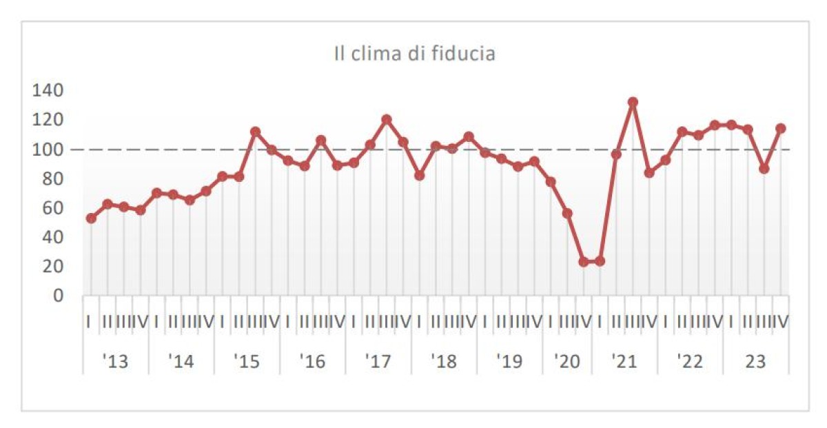 In chiaroscuro le aspettative per il I° trimestre 2024, che continuano ad essere caratterizzate da elementi positivi pur in presenza di scenari non sempre incoraggianti. Tra le altre cose, infatti, è atteso un ulteriore rialzo dei listini a fronte di un clima di fiducia in salita (114,2), riposizionandosi sugli stessi livelli del 2022.