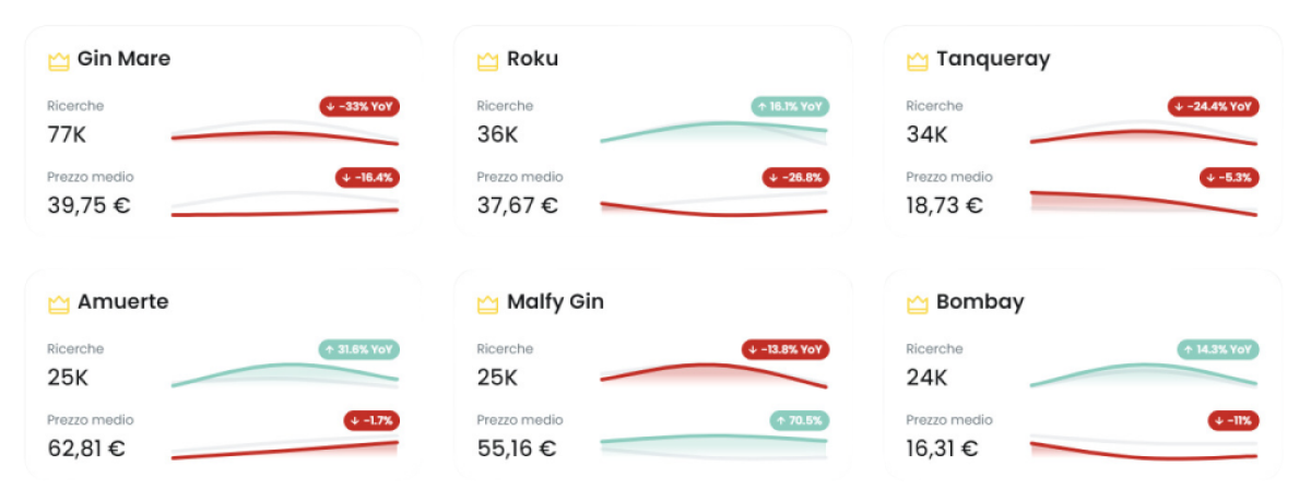 Il distillato più cercato su Amazon è il gin (con un un consistente aumento del +8% delle ricerche generali rispetto allo stesso periodo dell’anno 2022), seguito da whisky, amari e rum. Tra i brand più cliccati Gin Mare, Tanqueray, Amuerte, Bombay e Roku.