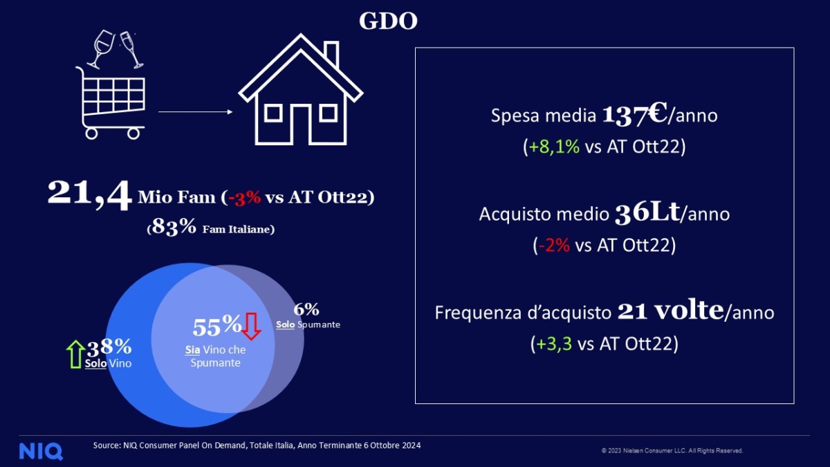 Lo studio di Uiv e NIQ ha toccato anche la Gdo: a trainare gli acquisti di vino sono le famiglie over 55 senza figli. Protagonisti di una spesa enologica pari a 1,83 miliardi di euro l’anno, questi Boomer (con una coda di GenX), lasciano quasi le briciole agli altri 2 grandi cluster individuati: le famiglie con figli (7,8 milioni) non arrivano al 24% della spesa complessiva, mentre le famiglie under 55 senza figli a carico si fermano a meno del 18%. «Assistiamo a una tendenza che si va affermando, la prima tribù è in crescita sempre più evidente, le altre invece faticano, in particolare i segmenti a basso reddito - spiega Eleonora Formisano di NIQ Italia -. Una polarizzazione dei consumi di vino basata su discriminanti divenute strutturali, come l’età e la disponibilità economica».