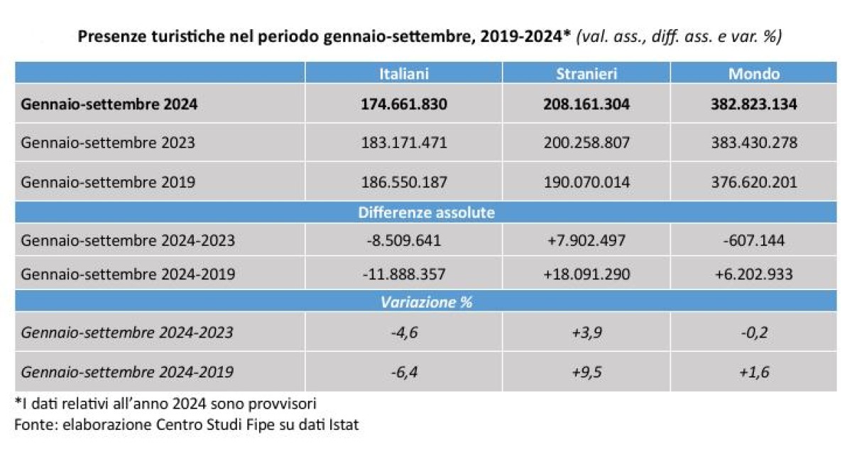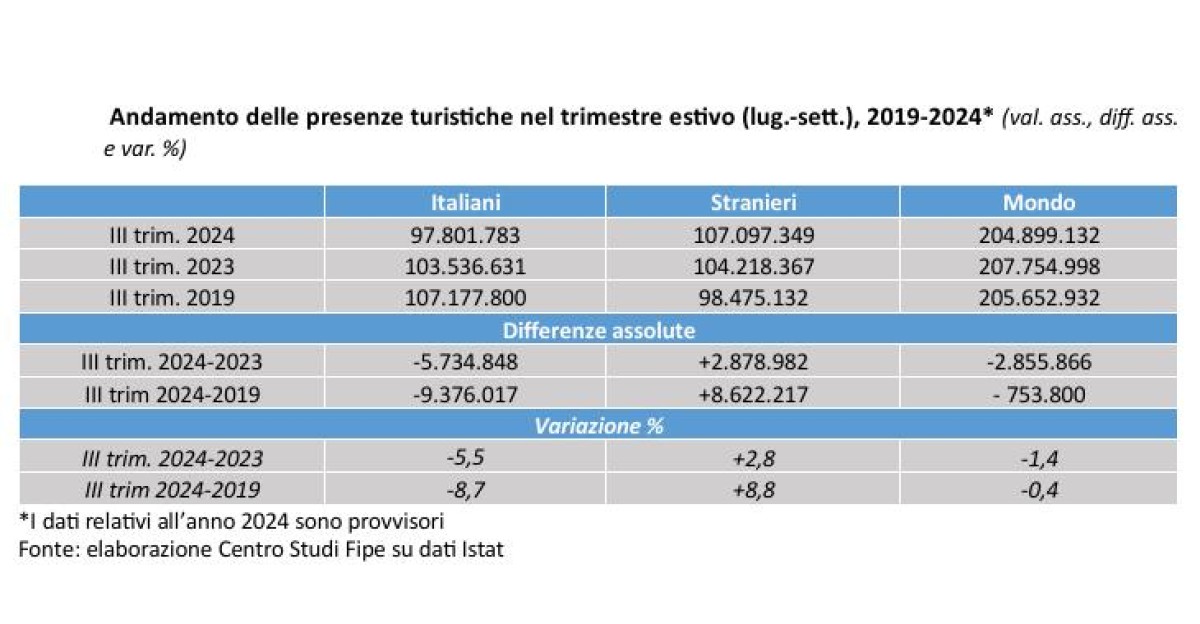 Saldo negativo per la stagione estiva 2024 italiana. A fotografare il calo sono i dati Istat nel terzo trimestre 2024 (luglio-settembre), che registrano una diminuzione delle presenze turistiche rispetto allo scorso anno pari a circa 2,9 milioni (-1,4%).