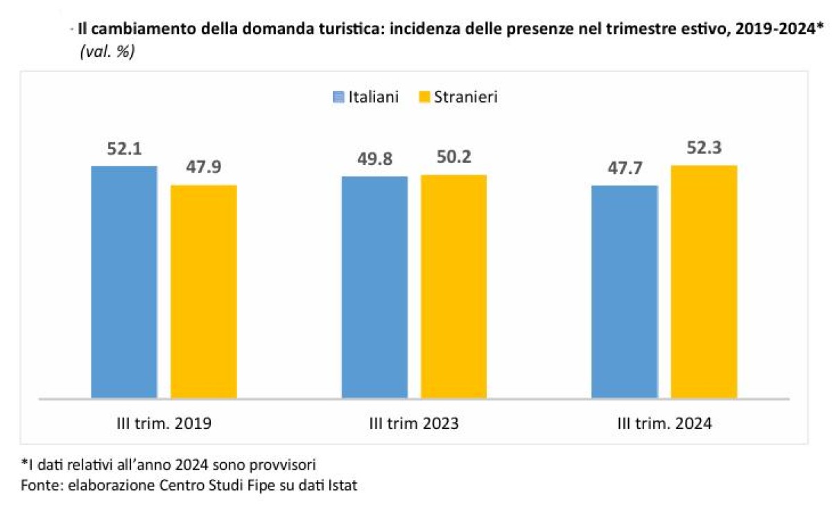 I flussi estivi sono stati trainati dai visitatori internazionali (+2,8%), che tuttavia hanno solo in parte compensato la flessione del turismo domestico (-5,5%), mai tornato ai livelli pre-pandemia. Infatti, rispetto all’estate 2019 mancano all’appello 9,3 milioni di presenze di turisti italiani (-8,7%): un'emorragia quasi del tutto rimarginata grazie ai visitatori internazionali, che in cinque anni hanno fatto registrare un aumento delle presenze di 8,6 milioni (+8,8%). Proprio nell’estate 2024 si è registrato il sorpasso, mai avvenuto prima d’ora, delle presenze straniere (52.3%) su quelle dei turisti italiani (47.7%).
