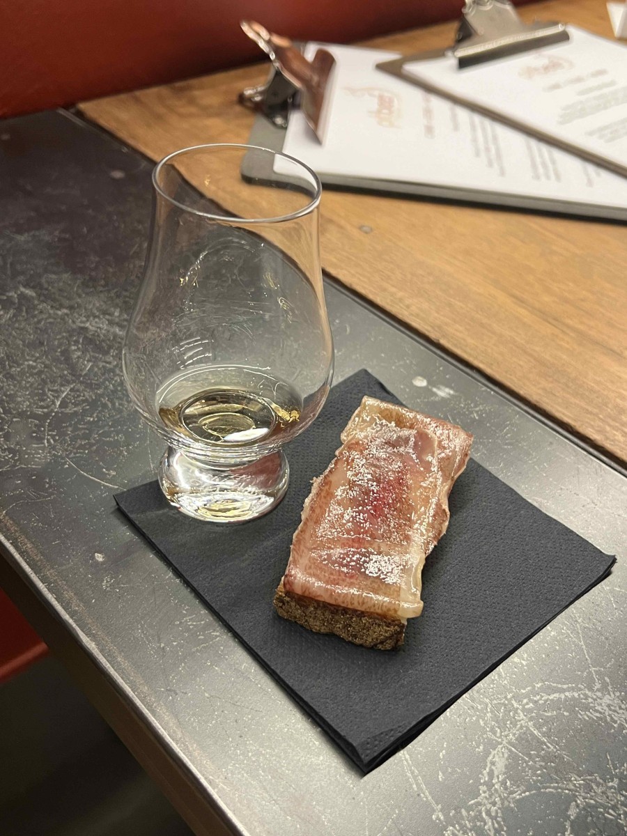 Dopo un cocktail di benvenuto - un Bourbon Tonic (Remus Whiskey) - durante la serata sono stati offerti tre assaggi: un Crostino con lardo di Wagyu & Sasayaki Malt Whisky (di Sake Company), la Bavetta di Black Angus & Single Cask Caol Ila Torbato (di The Art Collection); e per finire, una Torta al cioccolato fondente & Sole The Italian Malt Whisky (Puni). Nel primo caso il lardo di Wagyu viene accostato a un whisky giapponese: «Qui l’incontro tra distillato che sgrassa la carne grassa del lardo è ideale e va gustato – spiega chef Bisogni - come fosse una salsa aggiunta, gustando un pezzetto di carne e una goccia di whisky. In questo modo si tiene sotto controllo la nota alcolica e si dà spazio alla degustazione».