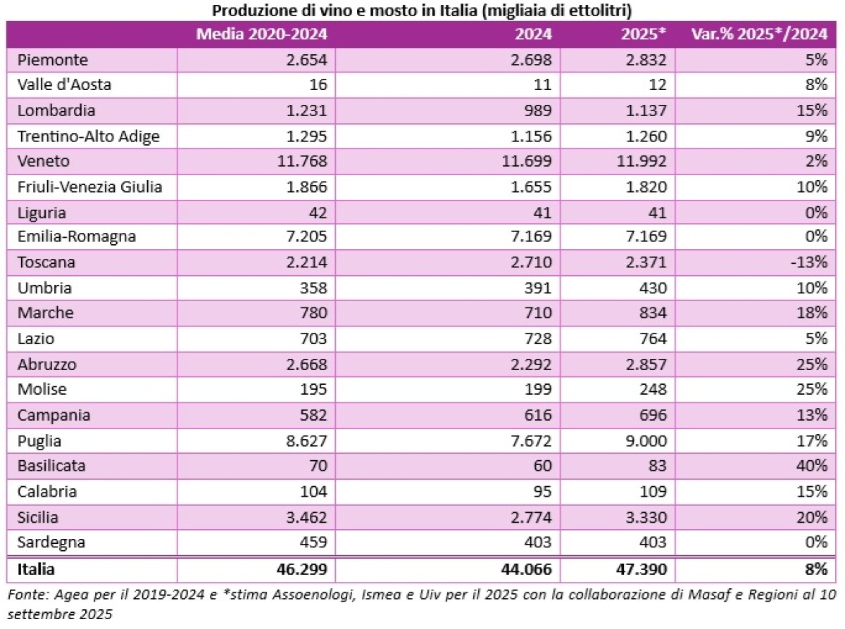 L’incremento produttivo atteso per questa vendemmia si distribuisce in modo tutt’altro che omogeneo lungo la Penisola. A spingere la crescita è sicuramente il Sud, dove il raccolto registra un balzo a due cifre (+19%) - trainata dalla performance della Puglia (+17%) – grazie alla disponibilità idrica accumulata in primavera che ha consentito ai vigneti delle regioni meridionali di reagire bene alle ondate di caldo di giugno e agosto. Aumenta la produzione, anche se con quantità più contenute, anche il Settentrione, che vede nel Nord Ovest (+8%) la Lombardia in netta ripresa, con un +15% sullo scorso anno ma ancora a -8% rispetto alla produzione media 2020-2024. Risulta complessivamente in aumento anche la produzione dei vigneti del Nord Est (+3%), dove un’estate altalenante è stata preceduta da una primavera abbondantemente piovosa, che ha richiesto una gestione attenta delle fitopatie. In ordine, il Friuli-Venezia Giulia mette a segno l’incremento maggiore (+10%), seguito dal Trentino-Alto Adige (+9%) e Veneto (+2%), con una crescita molto limitata a fronte di un’annata 2024 in linea con la media del quinquennio. Stabile l’Emilia-Romagna, divisa tra gli incrementi della Romagna e i cali, soprattutto nel peso delle uve, in Emilia. Negativo, infine, il segno del Centro (-3%), dove le performance di Umbria (+10%), Marche (+18%) e Lazio (+5%) non riescono a compensare la perdita della Toscana (-13%), fisiologica dopo un 2024 veramente abbondante.