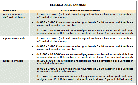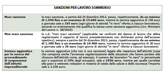 Tra le varie misure, ricordiamo l’approvazione dell’incremento delle sanzioni amministrative riguardanti le violazioni su lavoro regolare e sicurezza nei luoghi di lavoro e la contestuale assunzione di nuovo personale ispettivo. In particolare il Legislatore ha ridefinito – rispetto a quelli previsti nel decreto legge 23 dicembre 2013, n. 145 - gli importi sanzionatori collegati alle irregolarità in materia di orario di lavoro e di lavoro sommerso (articolo 14 della legge n. 9 del 2014).