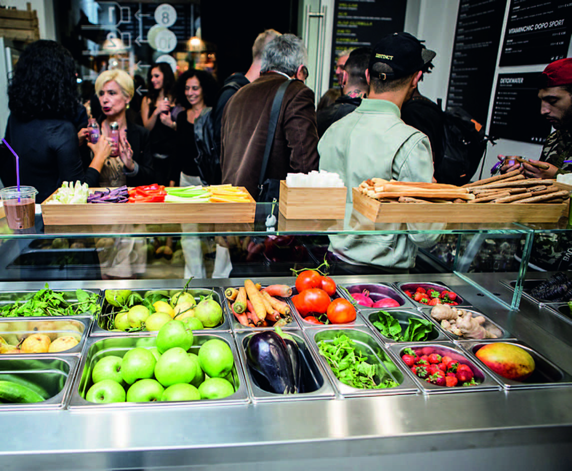 “Il primo natural bar – personal juice che, direttamente da Los Angeles, mette a disposizione una gamma completa di prodotti interamente naturali, insieme ad un’esclusiva linea di detox a base di succhi personalizzabili secondo le specifiche esigenze di ogni organismo. Per la prima volta in Italia ecco un natural bar interamente dedicato alla cura dell’organismo e alla salute del nostro corpo.” Dall’America arriva in via Vigevano 6 a Milano un nuovo format che unisce al gusto, salute e bellezza. Grazie ai personal juice ed a una gamma di prodotti interamente naturali propone un percorso personalizzato di depurazione. Un natural bar interamente dedicato alla cura dell’organismo e alla salute grazie alle proprietà benefiche della frutta e della verdura: la scelta spazia da succhi spremuti a freddo, smoothies, la Linea Vitamin Sport (completamente dedicata agli sportivi), detox water, zuppe, una collezione di hummus, insalate, wrap e piatti freschi del giorno. Il bar è caratterizzato da un’ambiente luminoso e da una parete in cui sono state appese delle cassette di legno del mercato con frutta e verdura. La parete verde e colorata mette al centro la materia prima utilizzata per i succhi restituendo colore e forma alle bevande. Un bar caratterizzato dalla frutta e dalla verdura. Anche lungo la vetrina del banco è esposta la frutta a pezzi pronta per essere frullata e servita. Piastrelle bianche e bancone in acciaio come un laboratorio di produzione chic.